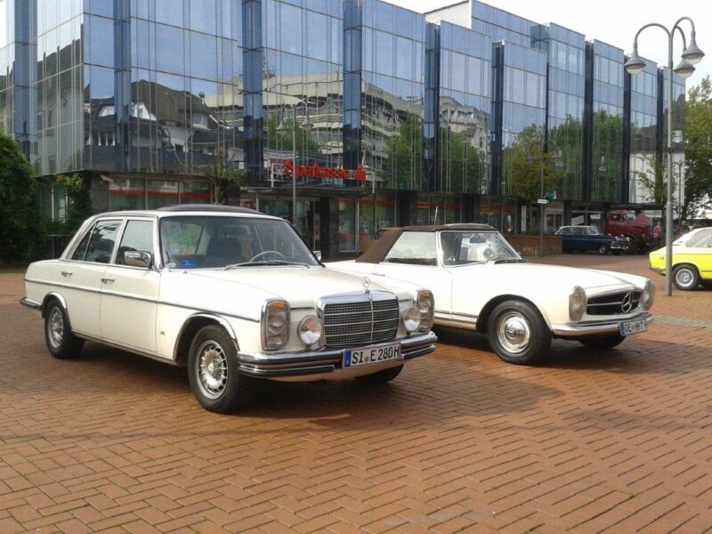 Modell W114, Typ 280E, 185PS, ausgeliefert 1974 nach Siegen. Seit 1988 in meinem Besitz, selbst umgebaut auf Handgas/Bremse in 2008.